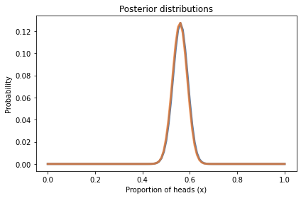 Given the data, we computed the posterior distribution for x, the probability a Euro coin comes up heads.