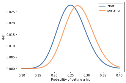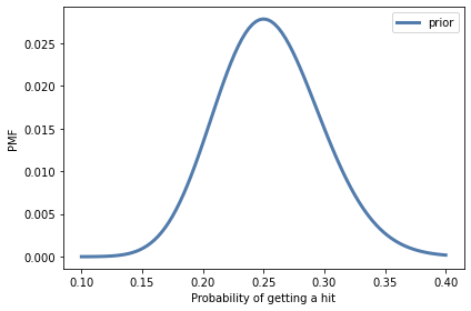 This distribution indicates that most players have a batting average near 250, with only a few players below 175 or above 350. I’m not sure how accurately this prior reflects the distribution of batting averages in Major League Baseball, but it is good enough for this exercise.