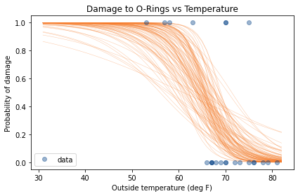Based on this figure, it seems plausible that the probability of damage is related to temperature. If we assume this probability follows a logistic model, we can write: