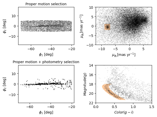 plt.title('Proper motion + photometry selection', fontsize='medium')