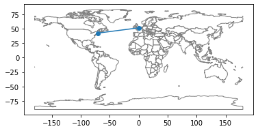 Now we can use Geopandas to show these points and lines on a map. The following cells load a map of the world and plot it.
