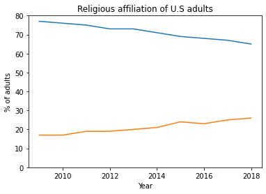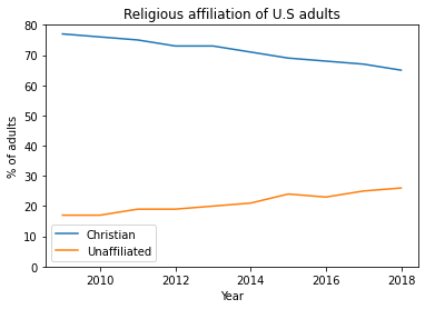 Exercise: In the original figure, the line labeled 'Christian' is red and the line labeled 'Unaffiliated' is gray.
