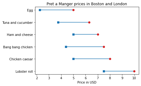 To connect the dots with lines, we’ll use plt.hlines, which draws horizontal lines. It takes three arguments: a sequence of values on the y-axis, which are the sandwich names in this example, and two sequences of values on the x-axis, which are the London prices and Boston prices.