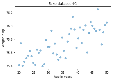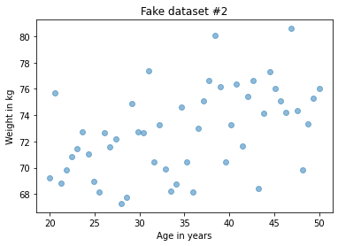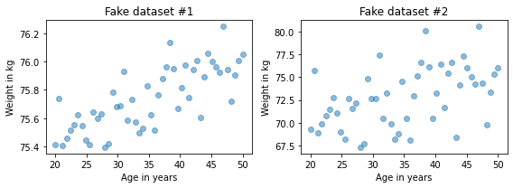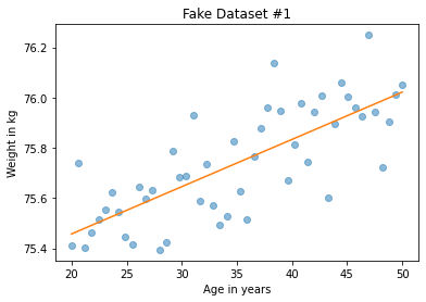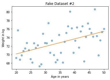 In the previous section, I generated fake datasets showing two hypothetical relationships between weight and age.
