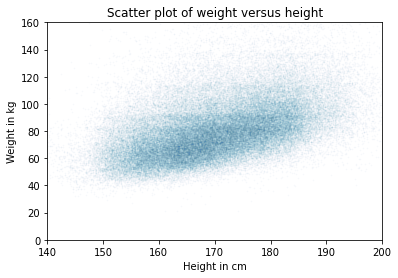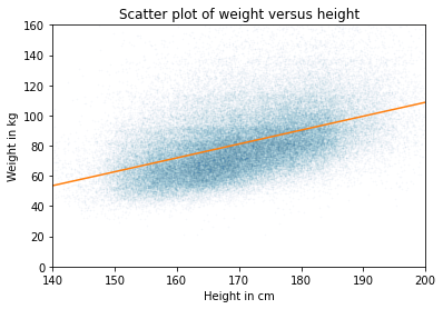 The functions xlim and ylim set the lower and upper limits of the x-axis and y-axis; in this case, we plot heights from 140 to 200 centimeters and weights up to 160 kilograms.