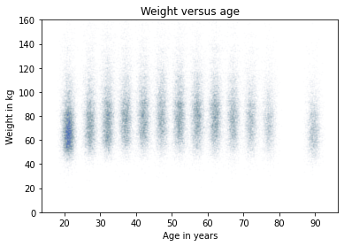 plt.plot(age_jitter, weight_jitter, 'o', alpha=0.01, markersize=0.5)