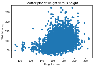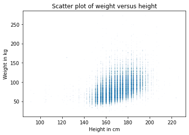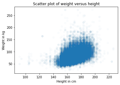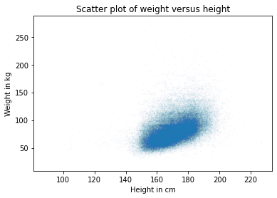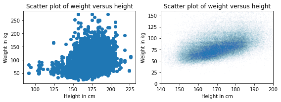 Each marker represents the height and weight of one person. Based on the shape of the result, it looks like taller people are heavier, but there are a few things about this plot that make it hard to interpret. Most importantly, it is overplotted, which means that there are markers piled on top of each other so you can’t tell where there are a lot of data points and where there is just one. When that happens, the picture can be misleading.