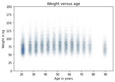 Exercise: Do people tend to gain weight as they get older? We can answer this question by visualizing the relationship between weight and age. But before we make a scatter plot, it is a good idea to visualize distributions one variable at a time. So let’s look at the distribution of age.