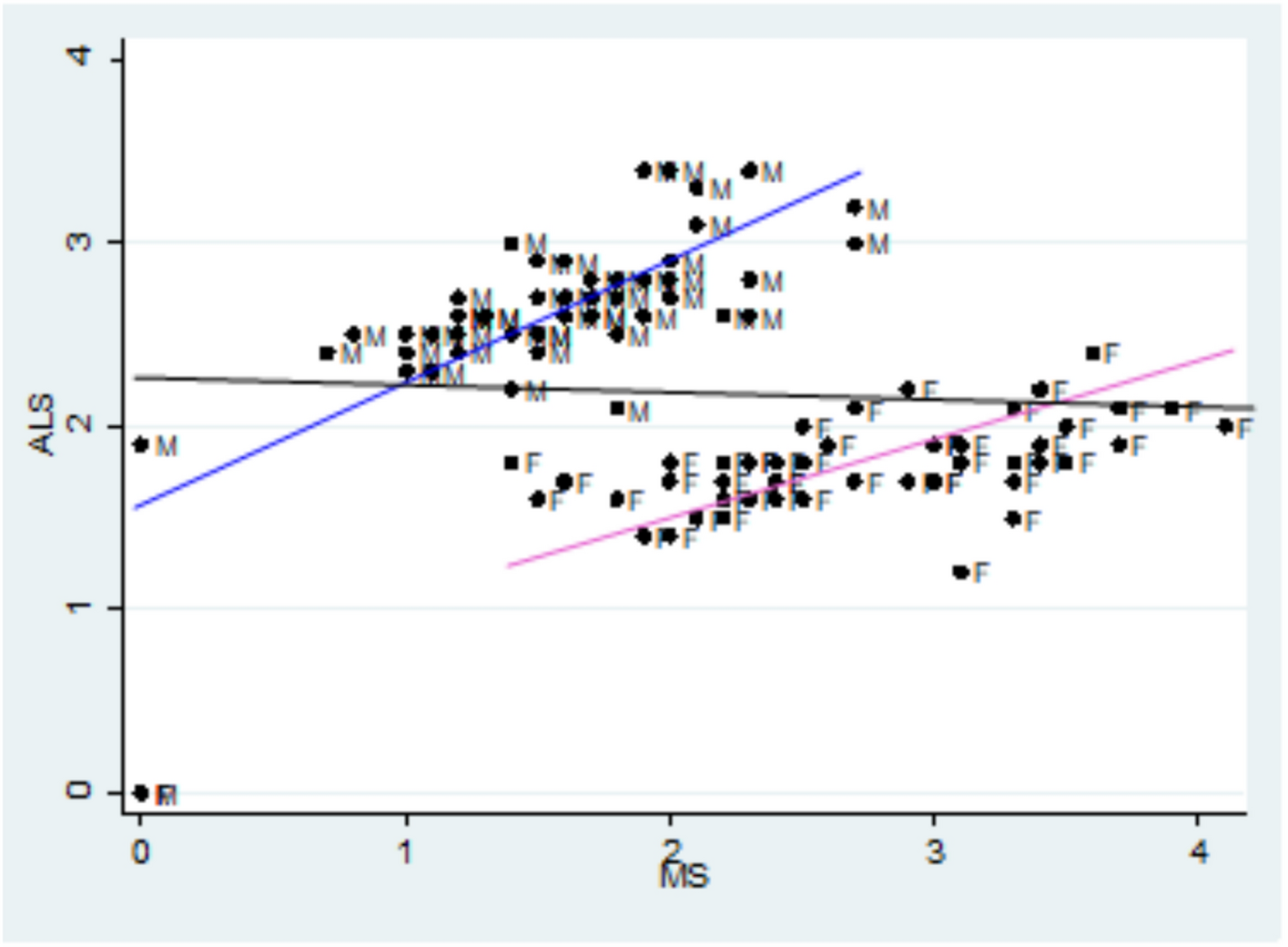 The x-axis is age adjusted death rates from MS, the y-axis is age-adjusted death rates from ALS. Each dot corresponds to one gender group in one state. The blue line fits the male data, with correlation 0.7. The pink line fits the female data, with correlation 0.75.