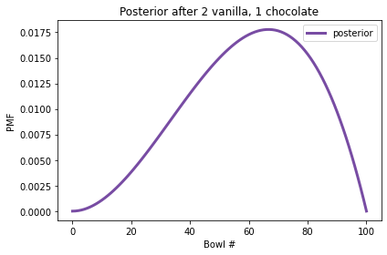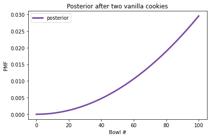 As you might suspect, this example isn’t really about bowls; it’s about estimating proportions. Imagine that you have one bowl of cookies. You don’t know what fraction of cookies are vanilla, but you think it is equally likely to be any fraction from 0 to 1. If you draw three cookies and two are vanilla, what proportion of cookies in the bowl do you think are vanilla? The posterior distribution we just computed is the answer to that question.