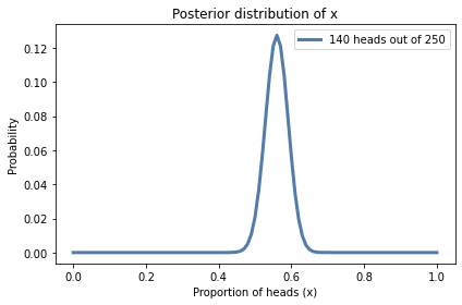 Starting with a uniform prior distribution for \(x\), we updated it with the given data, 140 heads and 110 tails. Then we used the posterior distribution to compute the most likely value of \(x\), the posterior mean, and a credible interval.