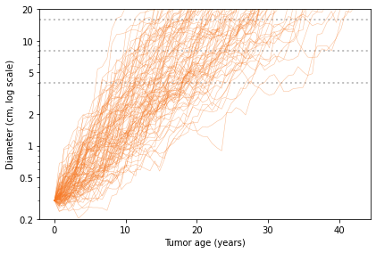For the initial diameter I chose 0.3 cm, because carcinomas smaller than that are less likely to be invasive and less likely to have the blood supply needed for rapid growth (see this page on carcinoma). For the maximum diameter I chose 20 cm.