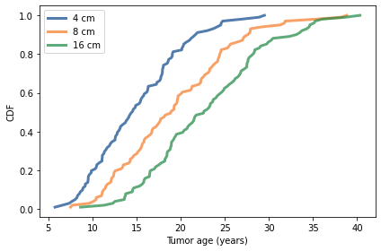 Given the size of a tumor at time of diagnosis, we would like to know the distribution of its age. To find it, we’ll run simulations of tumor growth to get the distribution of size conditioned on age. Then we’ll compute the distribution of age conditioned on size.