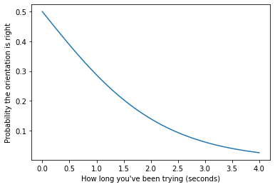 Now suppose that the prior probability is 0.5 that the orientation of the connector is correct, and you have been trying for 0.9 seconds. What is the likelihood that you would have to try so long?