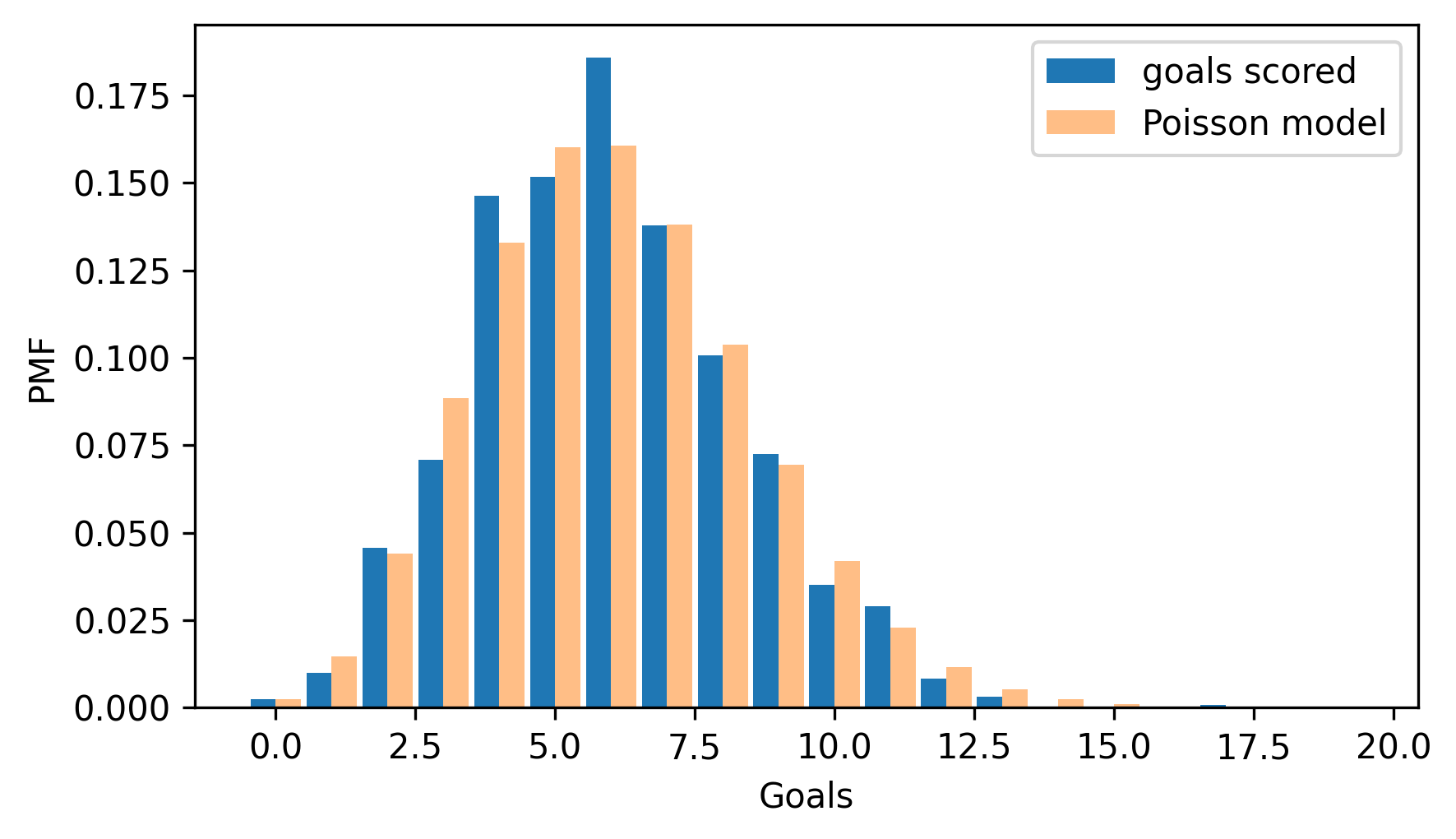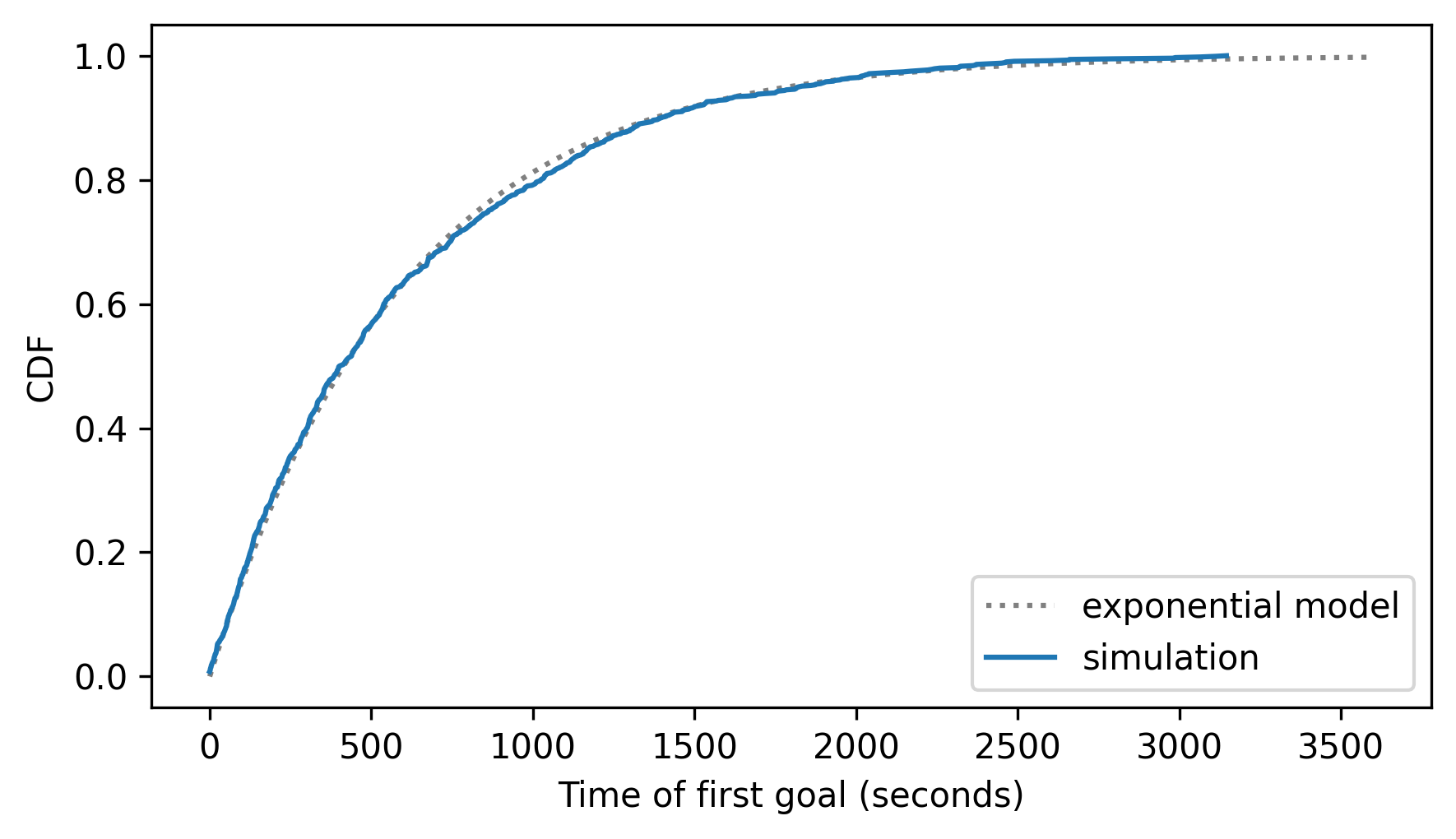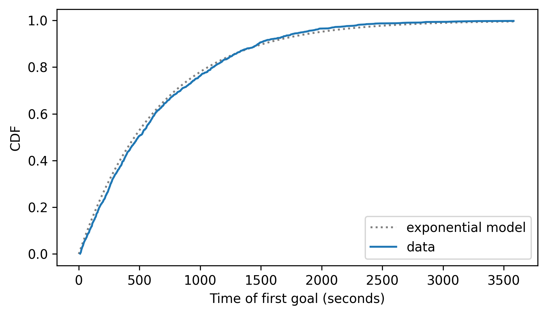 Earlier in this chapter we saw that the time until the first goal in a hockey game follows an exponential distribution. If our model of goal-scoring is correct, a goal is equally likely at any time, regardless of how long it has been since the previous goal. And if that’s true, we expect the time between goals to follow an exponential distribution, too.