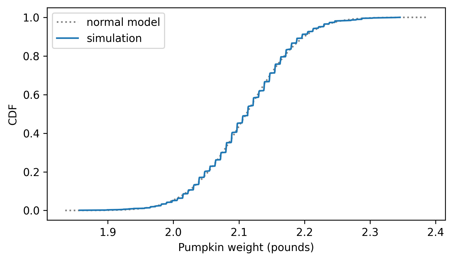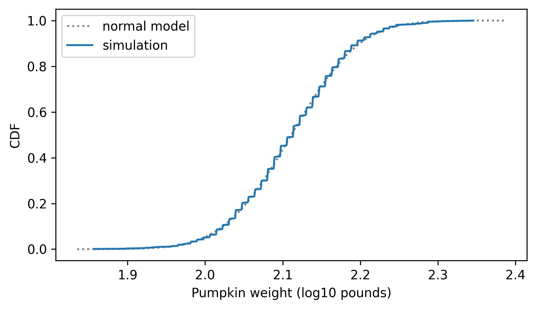 cdf_model, cdf_log_sim_weights, xlabel="Pumpkin weight (log10 pounds)"