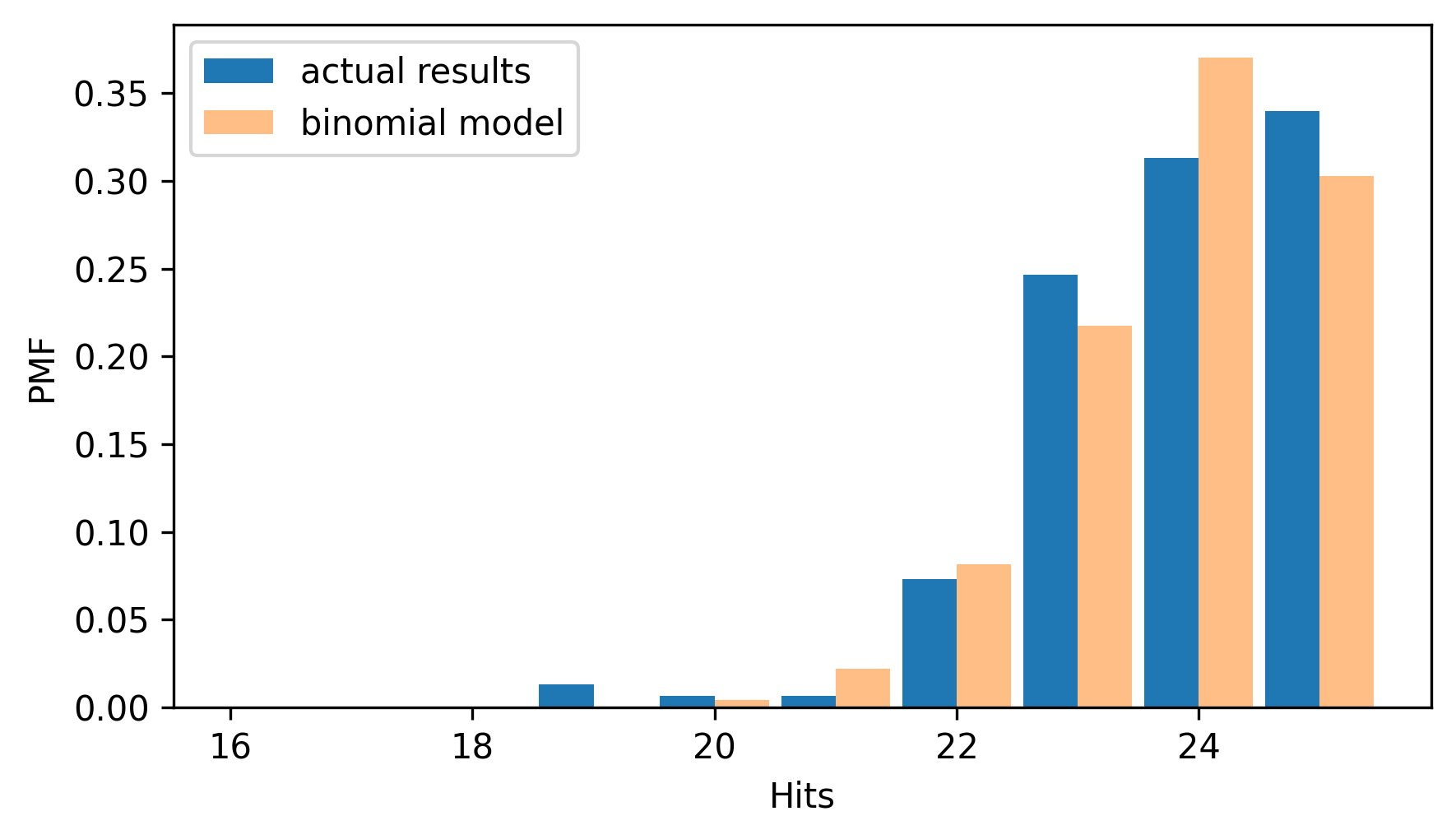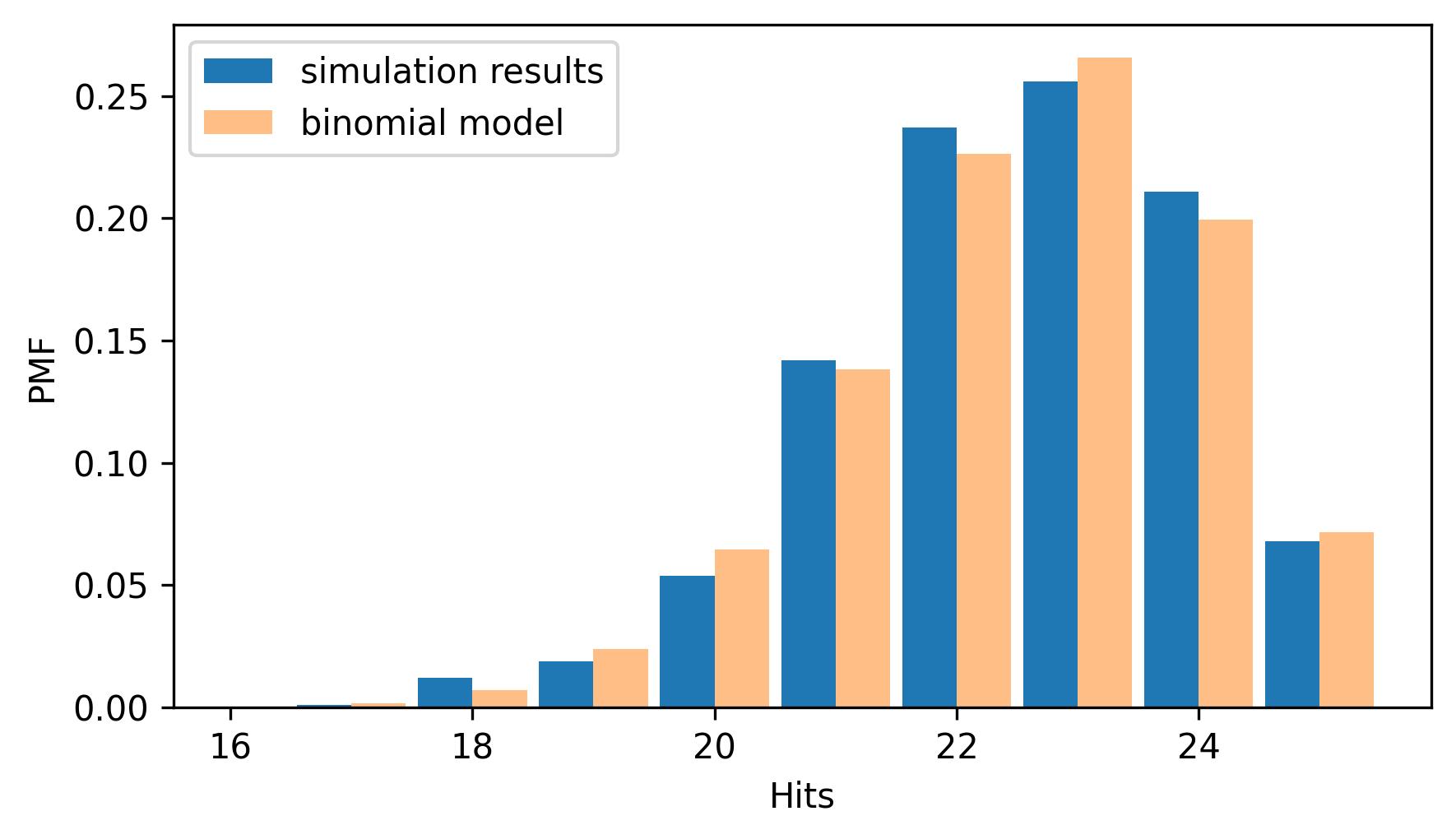binomial_pmf computes the probability of getting k hits out of n attempts, given p.