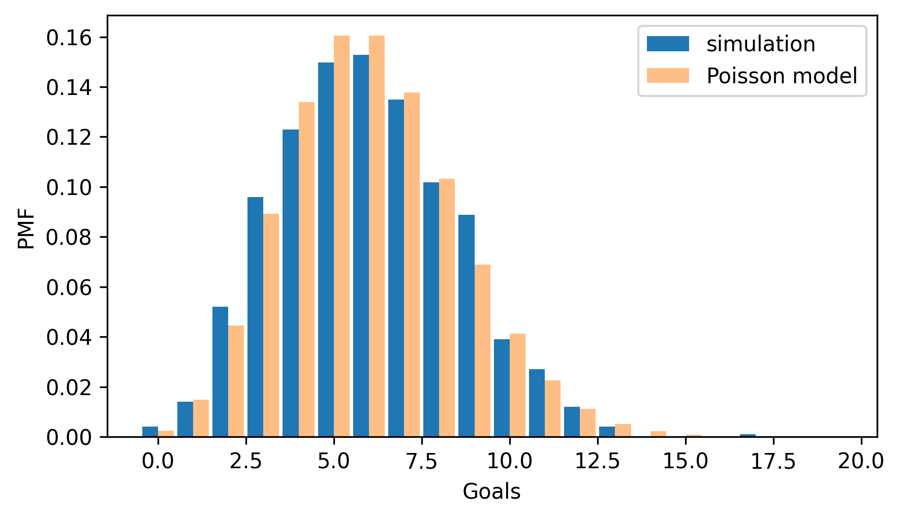 They are similar, with small differences because of random variation in the simulation results. This agreement should not be surprising, because the simulation and the model are based on the same assumptions – particularly the assumption that every attempt has the same probability of success. A stronger test of a model is how it compares to real data.