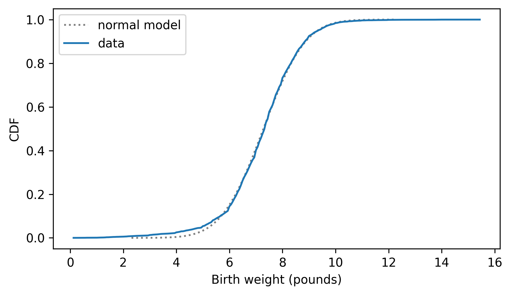 The normal model fits the data well except below 5 pounds, where the distribution of the data is to the left of the model – that is, the lightest babies are lighter than we’d expect in a normal distribution. The real world is usually more complicated than simple mathematical models.