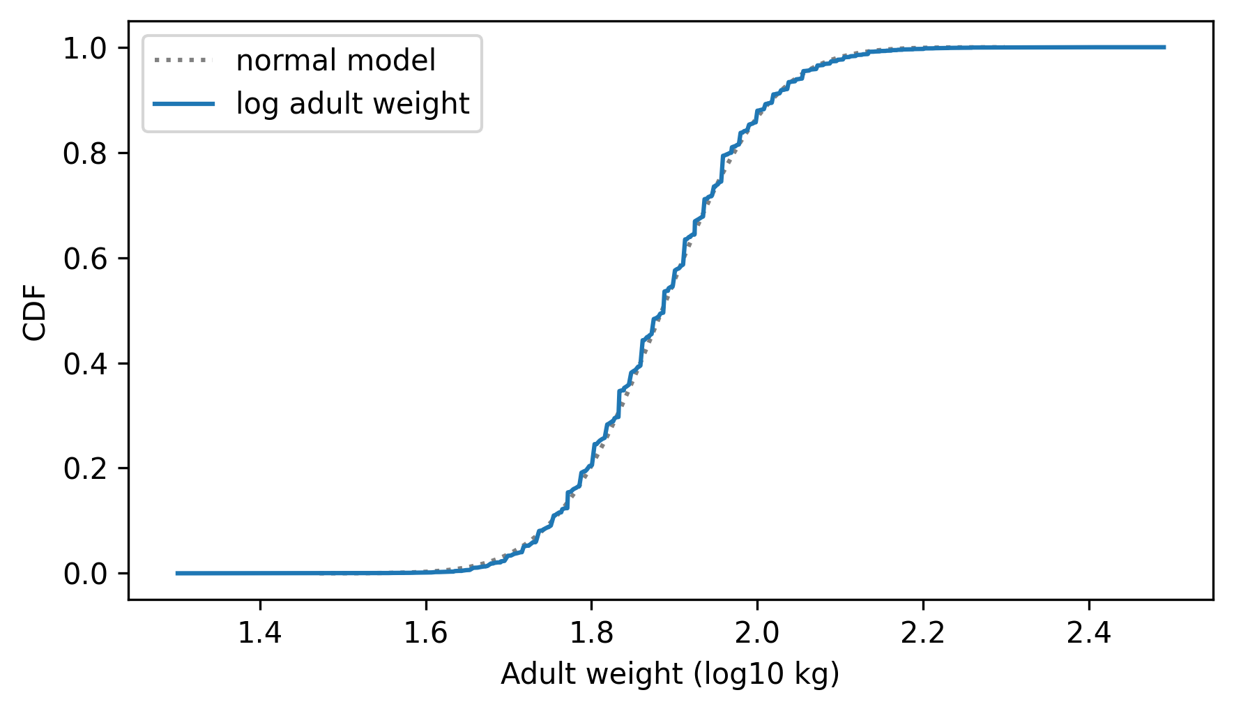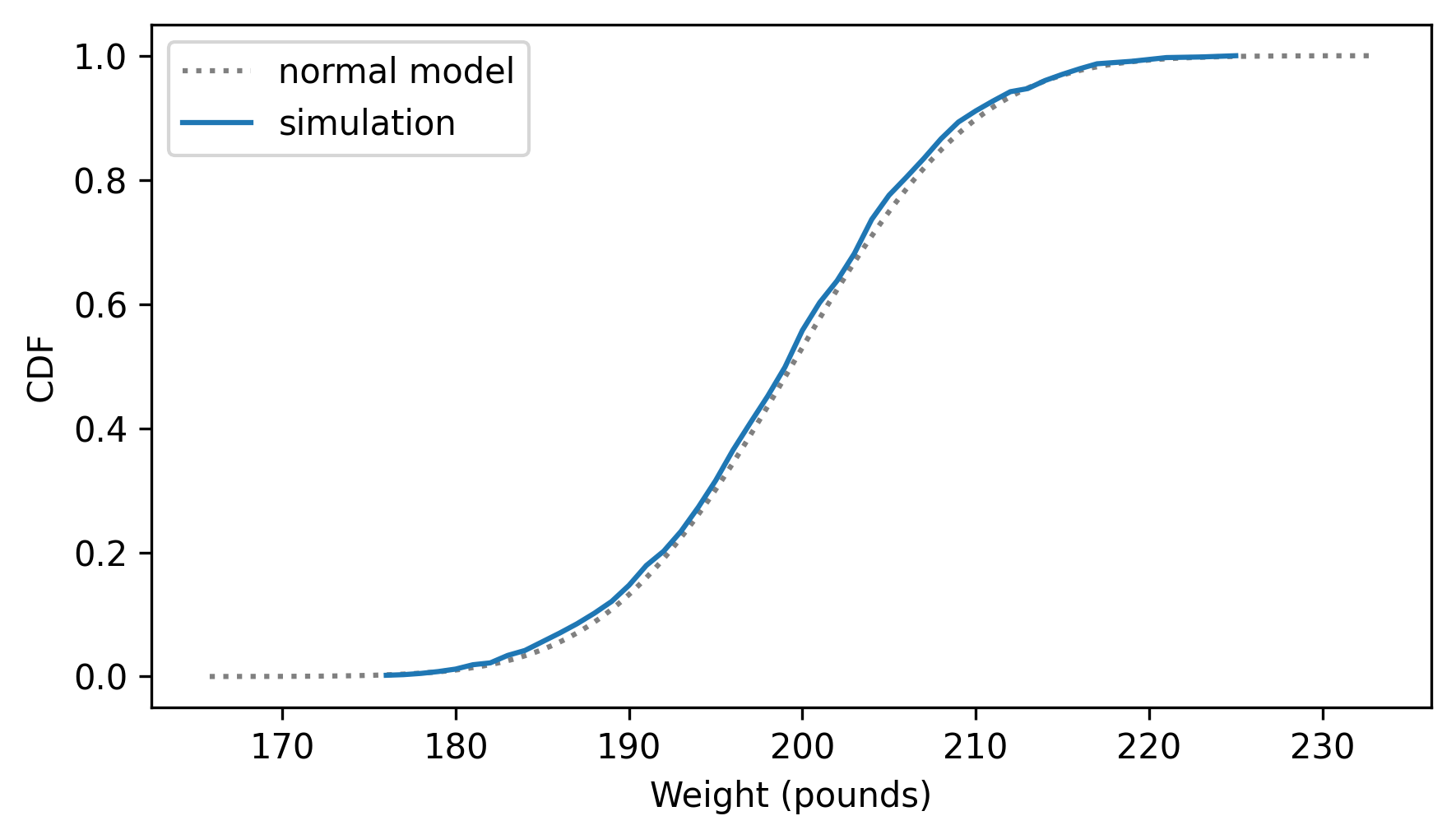 It is sometimes surprising when data from a natural phenomenon fit a theoretical distribution, but these observations can provide insight into physical systems. Sometimes we can explain why an observed distribution has a particular form. For example, in the previous section we found that adult weights are well-modeled by a lognormal distribution, which suggests that changes in weight from year to year might be proportional to current weight.